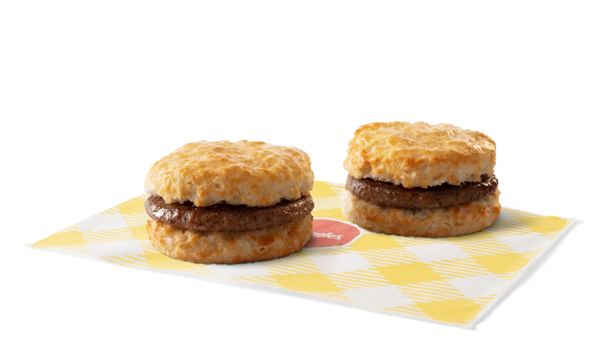 Country style sausage on a made-from-scratch buttermilk biscuit, served with Bo-Tato Rounds®, coffee or medium drink.